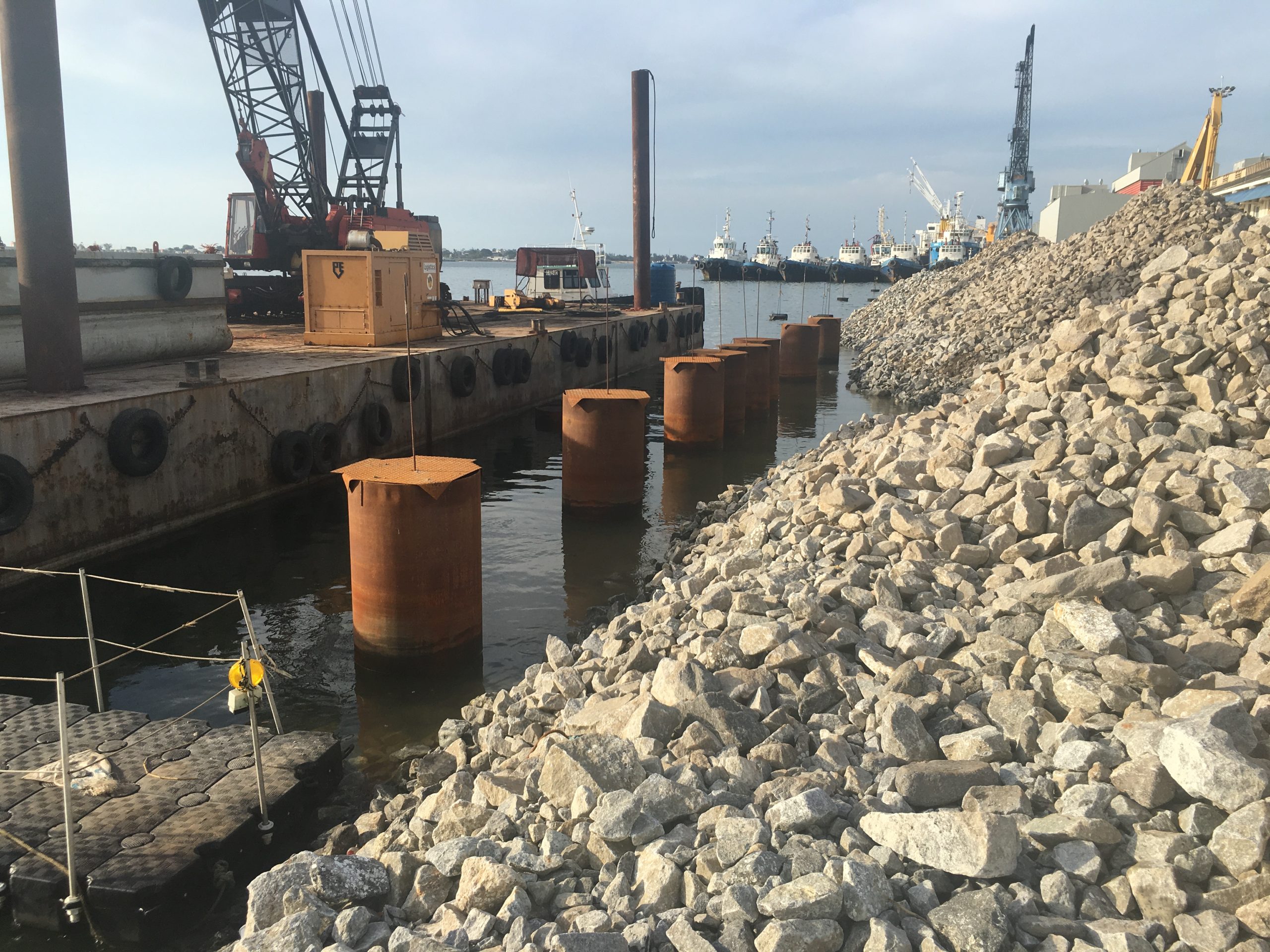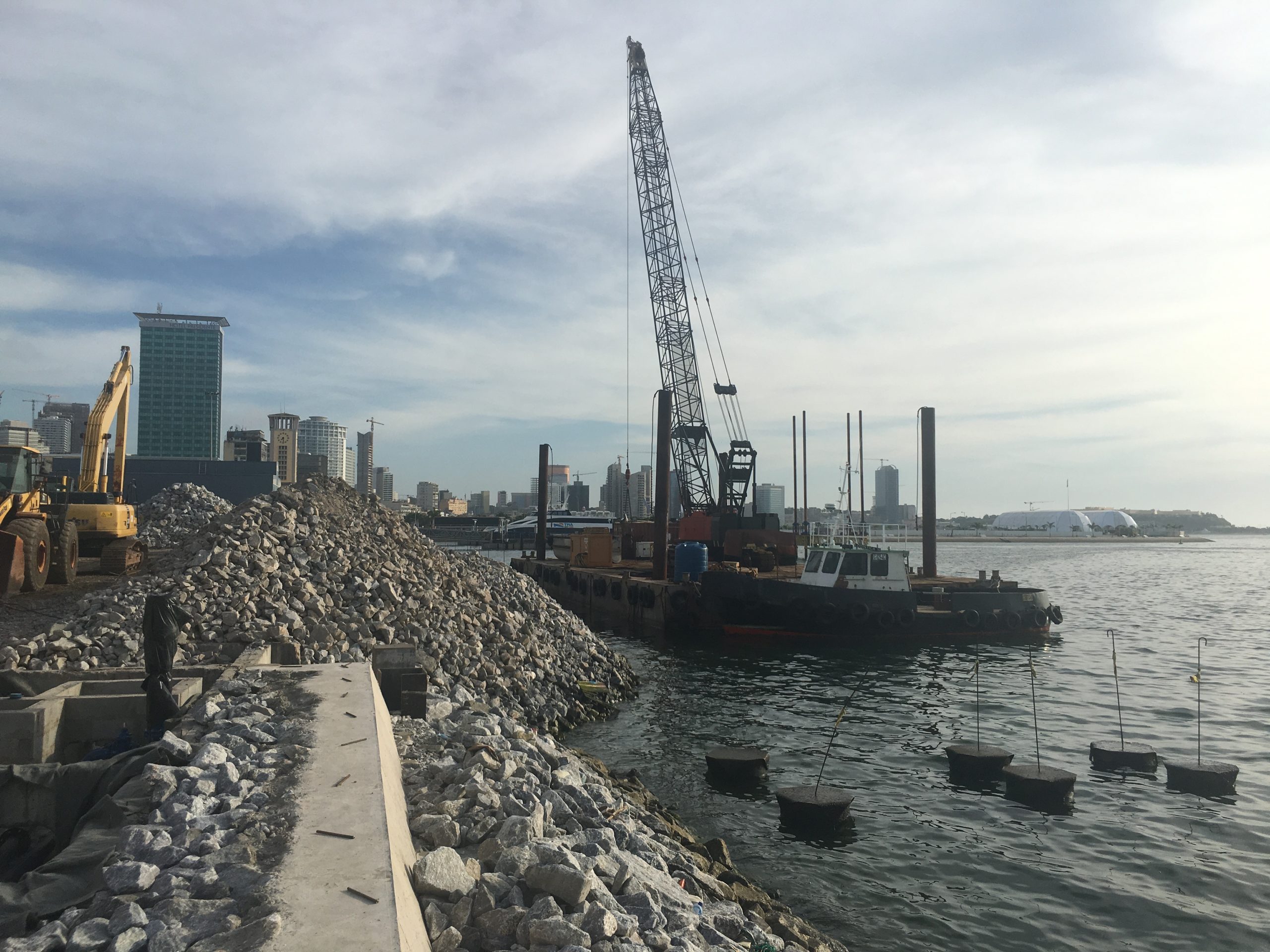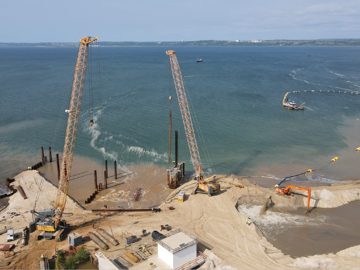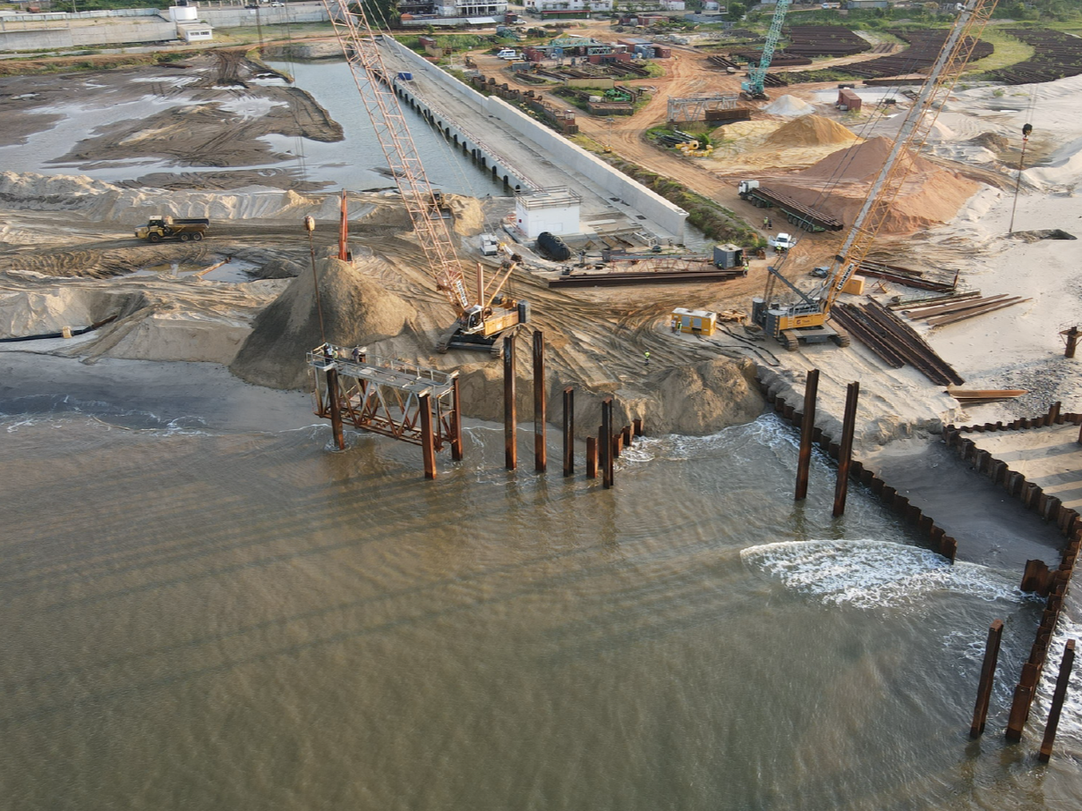 Execução das obras de construção do Porto de Cabotagem de Luanda, contribuindo para o desenvolvimento das infraestruturas portuárias e operações logísticas.